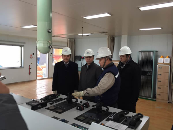 In the afternoon of January 13,2016, three leaders of the Ministry of Transport Integrated Management including deputy director Mr. Peng SiYi visited MV.“Chang Tian Long” produced by Haixin Heavy Industry and conducted a survey of the construction of 1000 tons emergency rescue and salvage floating crane. Deputy director of the Yangtze river on shipping administration Mr. Wei Zhigang , deputy director of theYangtze riverwaterway administration Mr. Yao Yong, and company leaders kept company with Mr. Peng to have a research on the technical condition and tested trial-sailing conditions. Mr. Peng listened to the report on the implement of the project in the meeting room, and affirmed the construction quality, functional localization and technical form of emergency rescue of MV.“Chang Tian Long”. Through running trial, anchoring trial and moving the ship test of the mooring position system, manned submersible test of diving system, ship dynamic position system function test , Mr. Peng thought the construction of this ship had met the requirement of the Ministry of Communications .Finally, Mr. Peng came up with requirement that we should make effort on completing crane tests and accomplish the connection and maneuver of diving systems to form fighting capacity as soon as possible. Mr. Wei and Mr. Yao demand completion of delivery at an early date and Post-Evaluation construction as soon as possible so as to accumulate experience for the modification and building of the following ships.