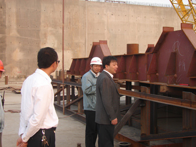 2011年10月8日下午,一輛大型平板運輸車載著巨大的塢門分段緩緩地進入船塢,兩臺100噸履帶式吊車將分段穩(wěn)穩(wěn)地吊起,放置到事先擺放好的塢墩上。江蘇海新船舶重工有限公司1#船塢塢門合攏準備工作就緒。公司董事長孟咸宏先生、陳五洲副總經(jīng)理親臨現(xiàn)場視察塢門合攏準備工作。次日上午,在炮竹聲中,塢門合攏儀式正式舉行。