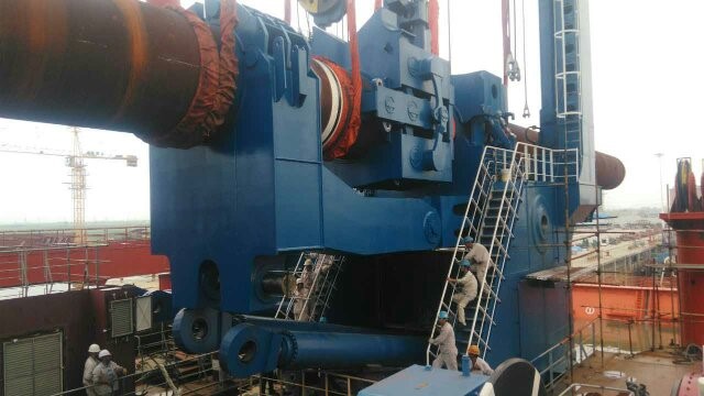 每條6500方絞吸式挖泥船配備兩套鋼樁夾具系統(tǒng),一套鋼樁夾具系統(tǒng)重量達(dá)350噸,吊裝到位后需要調(diào)整鋼樁夾具整體狀態(tài)使直徑550mm的銅質(zhì)銷軸穿入銷軸孔座,間隙只有0.1mm左右,另由于船塢與外界水域相通有漲落潮,此次吊裝的難度相當(dāng)大。針對以上困難我們制定了合理的切實可行的吊裝工藝,即根據(jù)水面漲落400噸龍門吊隨時調(diào)整鋼樁夾具高度,采用先校對一側(cè)軸孔待銅質(zhì)銷軸進(jìn)入1cm左右時再校對另一側(cè)銷軸孔。在各部門互相協(xié)作共同努力下,經(jīng)過3個小時的奮戰(zhàn),兩個直徑550mm的銅質(zhì)銷軸順利穿入船體的銷軸孔,第一套鋼樁夾具系統(tǒng)安裝完畢。在接下來的兩天時間,同樣順利的完成了另外3套鋼樁夾具系統(tǒng)的安裝。