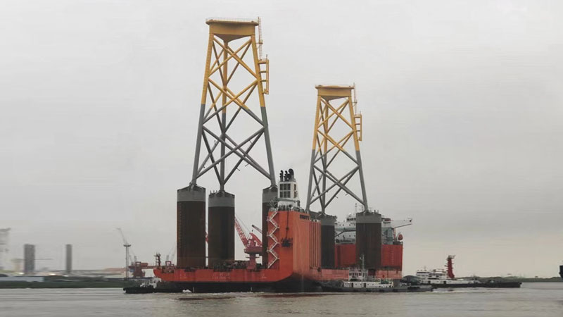 2021年6月17日,由江蘇海新船務重工有限公司制作的8MW吸力式導管架基礎A12和10MW吸力式導管架基礎A13兩套導管架裝船,綁扎完畢,開往招商重工...